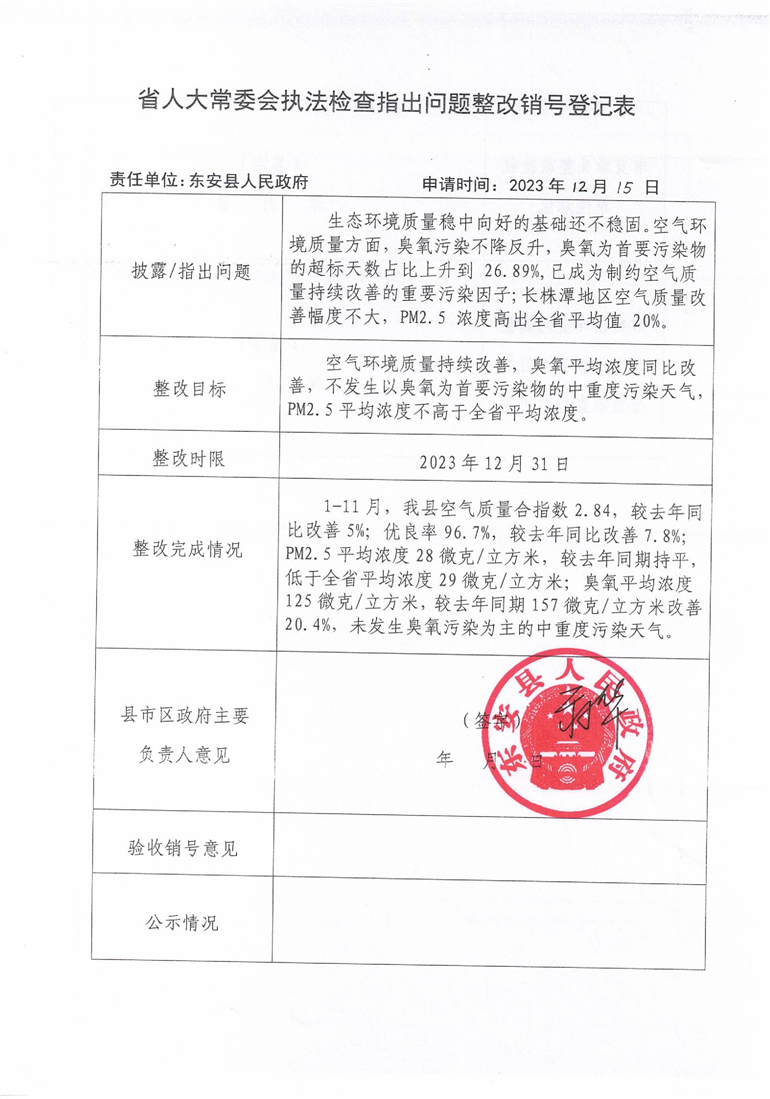 名称: 省人大常委会执法检查指出问题整改销号登记表(大气)