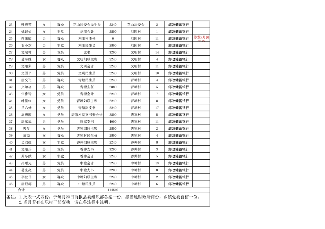 2023ray雷竞技官网入口花桥镇在职村干部工资发放表(2月份 )
