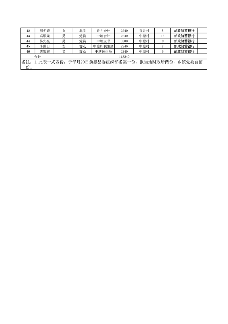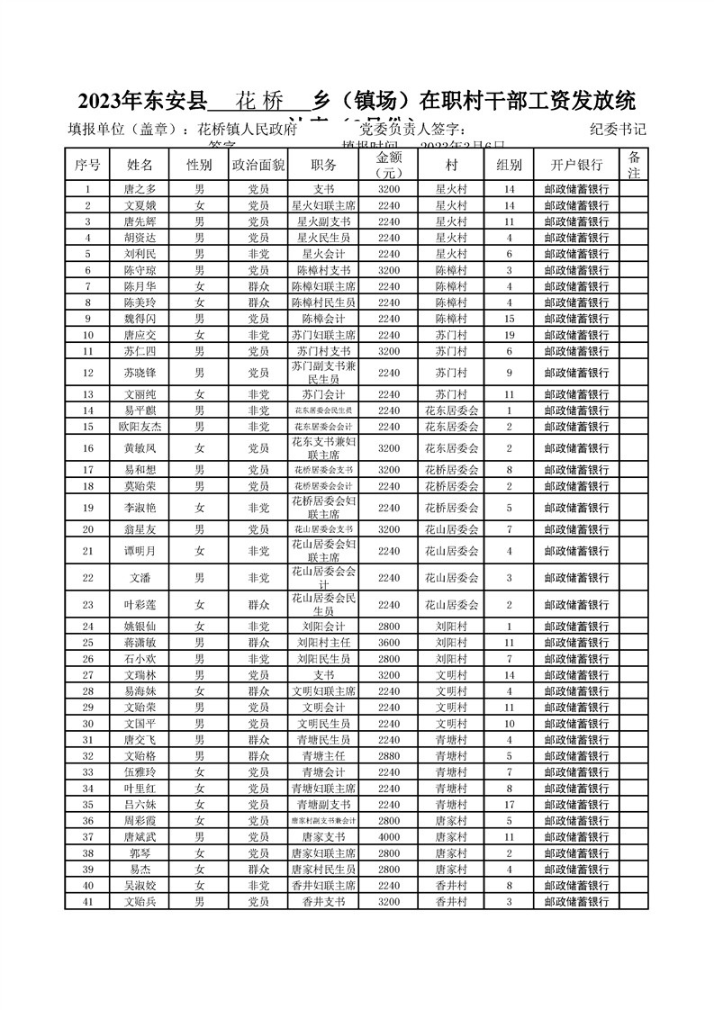 2023年ray雷竞技官网入口花 桥乡(镇场)在职村干部工资发放统计表(3月份)