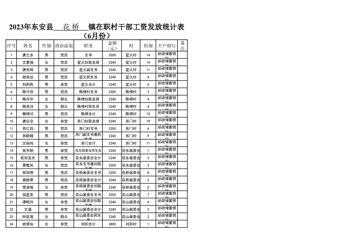 2023ray雷竞技官网入口花桥镇在职村干部6月份工资发放表