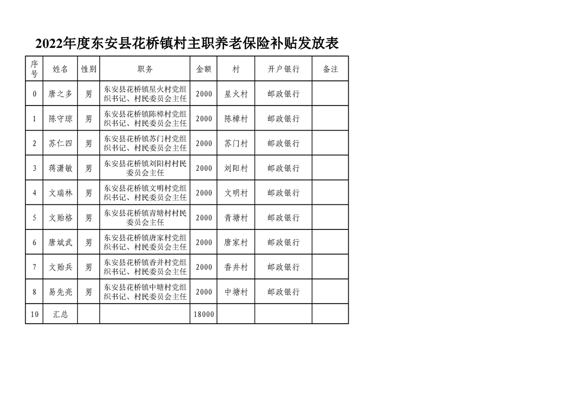 名称: 2022年度ray雷竞技官网入口花桥镇村主职养老保险补贴发放表