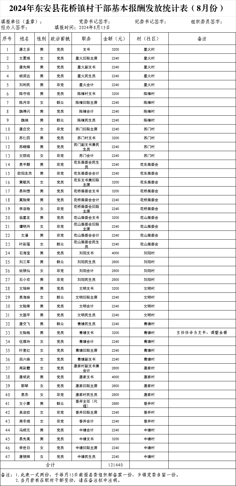 名称: 2024年ray雷竞技官网入口花桥镇村干部基本报酬发放统计表(8月份)