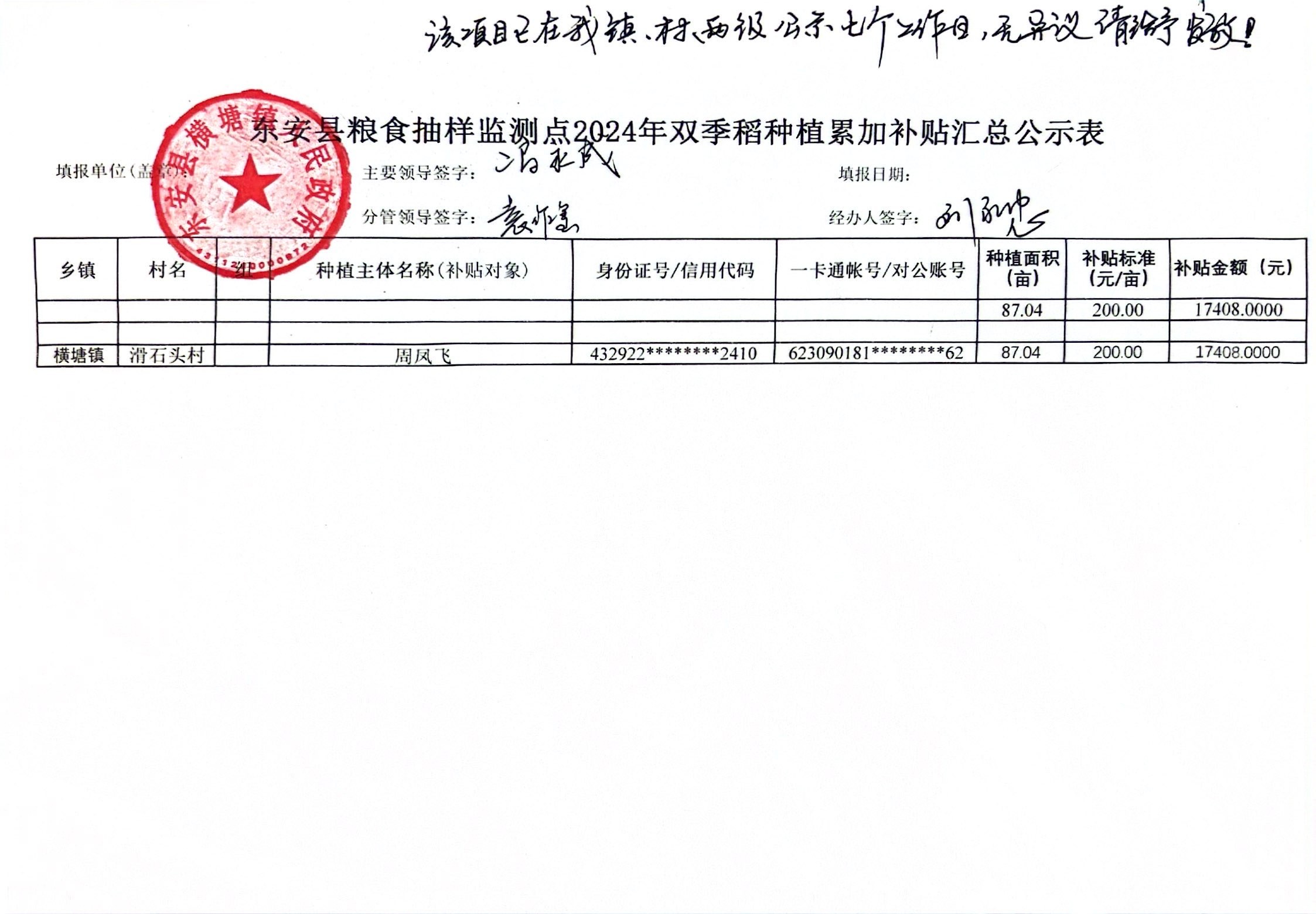 ray雷竞技官网入口横塘镇粮食抽样监测点2024年双季稻种植累加补贴汇总公示表