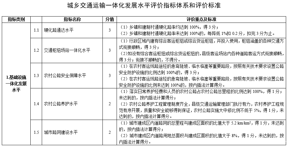 为进一步推动落实《交通运输部 国家发展改革委 公安部 财政部 国土资源部 住房城乡建设部 农业部 商务部 供销合作总社 国家邮政局 国务院扶贫办关于稳步推进城乡交通运输一体化提升基本公共服务水平的指导意见》(交运发〔2016〕184号),部研究制定了《城乡交通运输一体化发展水平评价指标体系和评价标准(征求意见稿)》,拟对县级行政区城乡交通运输一体化发展水平进行评价,并以县级评价为基础,加权评价省级行政区总体发展水平。现征求你单位意见,请认真组织研究,于2018年9月21日前将书面意见反馈我部。联系人:运输服务司 何明,电子邮箱:ysskyc@mot.gov.cn。