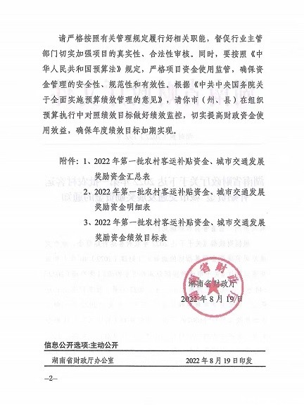 湖南省财政厅关于下达2022年第一批农村客运补贴资金城市交通发展奖励资金的通知
