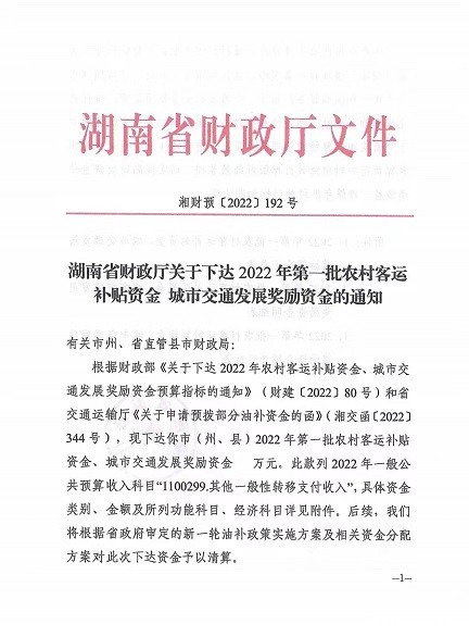 名称: 湖南省财政厅关于下达2022年第一批农村客运补贴资金城市交通发展奖励资金的通知