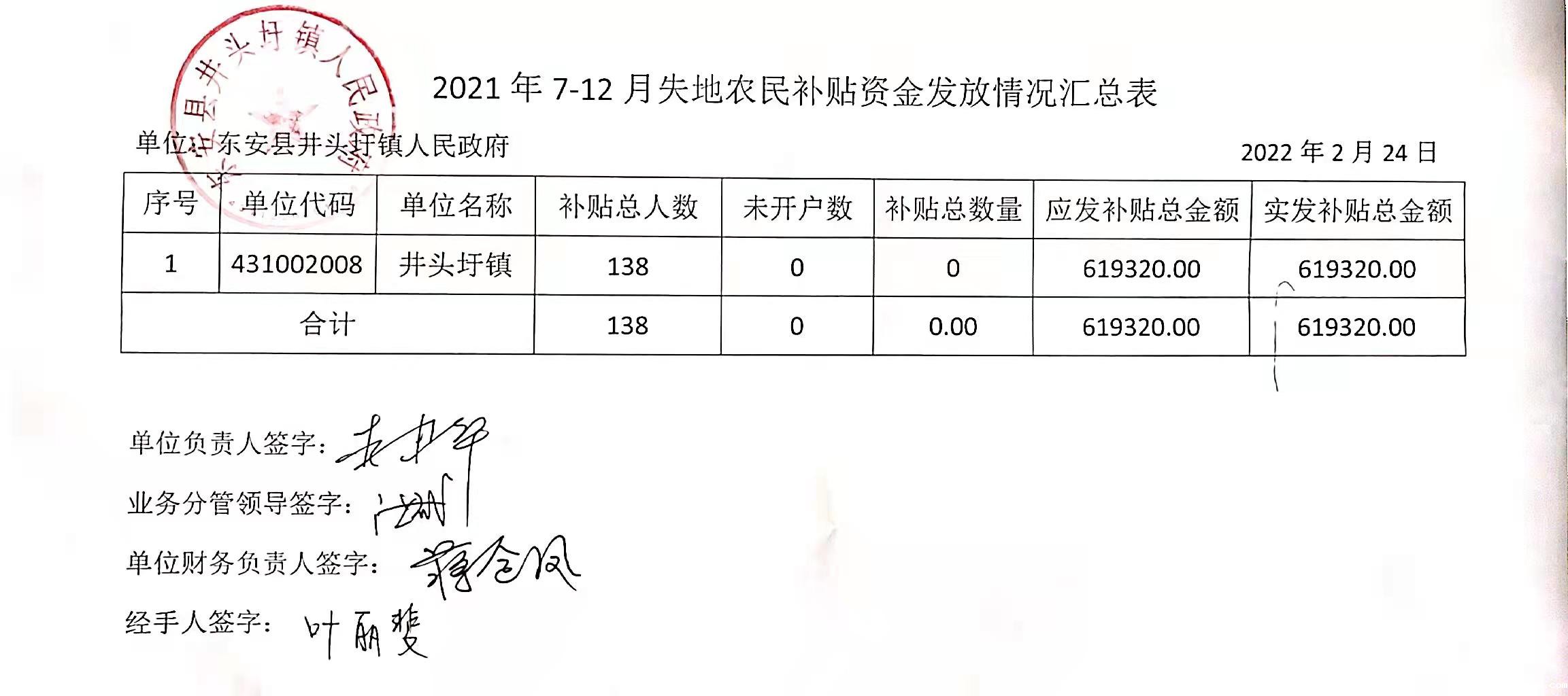 2021年7-12月失地农民补贴资金发放情况汇总表