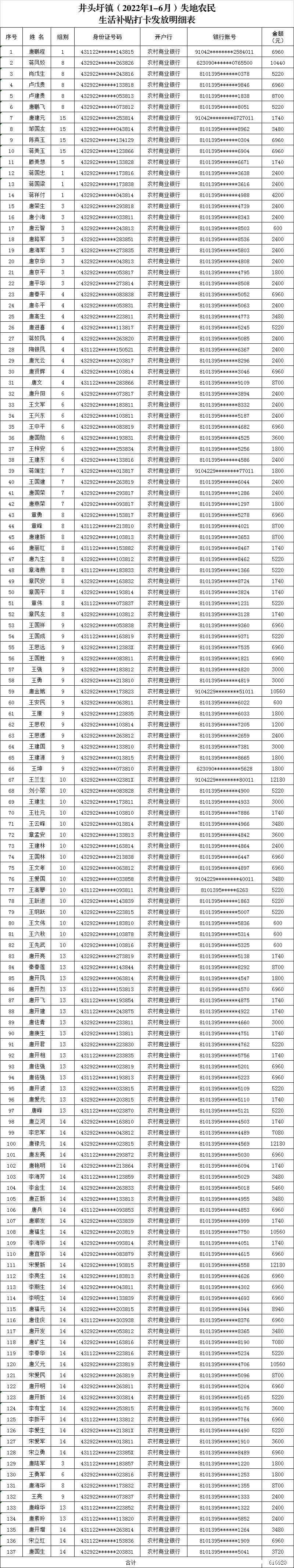名称: 井头圩镇(2022年1-6月)失地农民生活补贴打卡发放明细表
