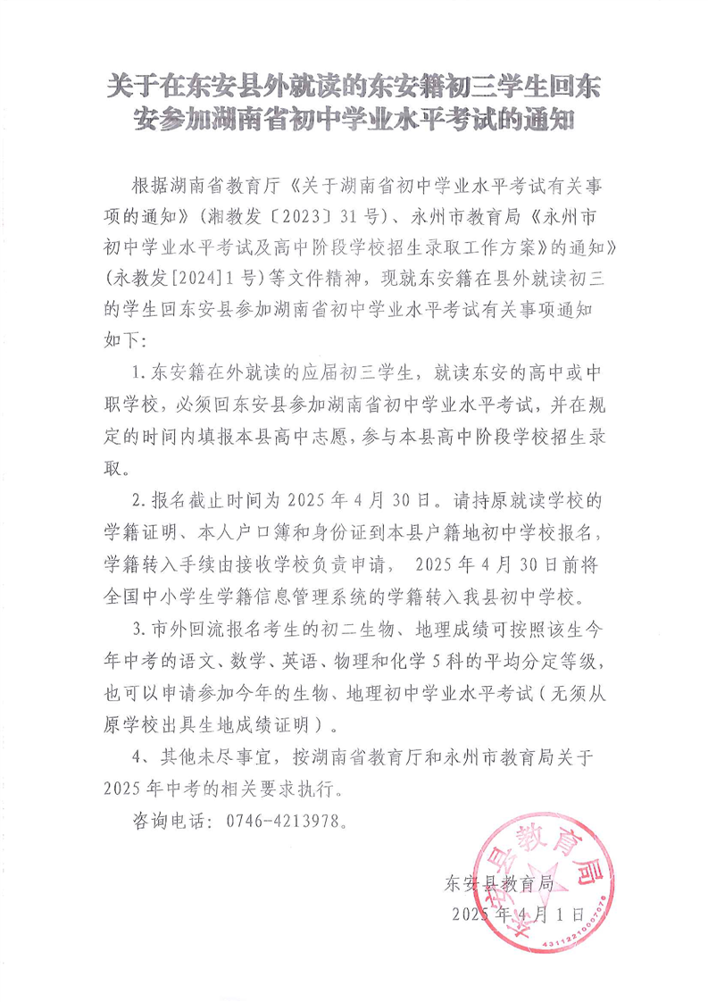 关于在ray雷竞技官网入口外就读的东安籍初三学生回东安参加湖南省初中学业水平考试的通知