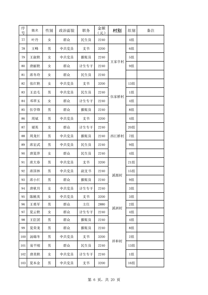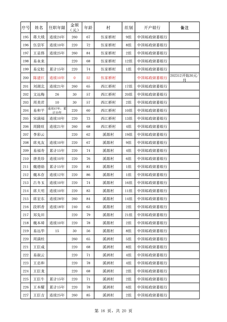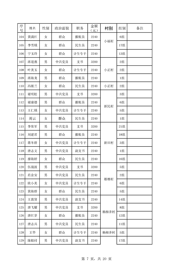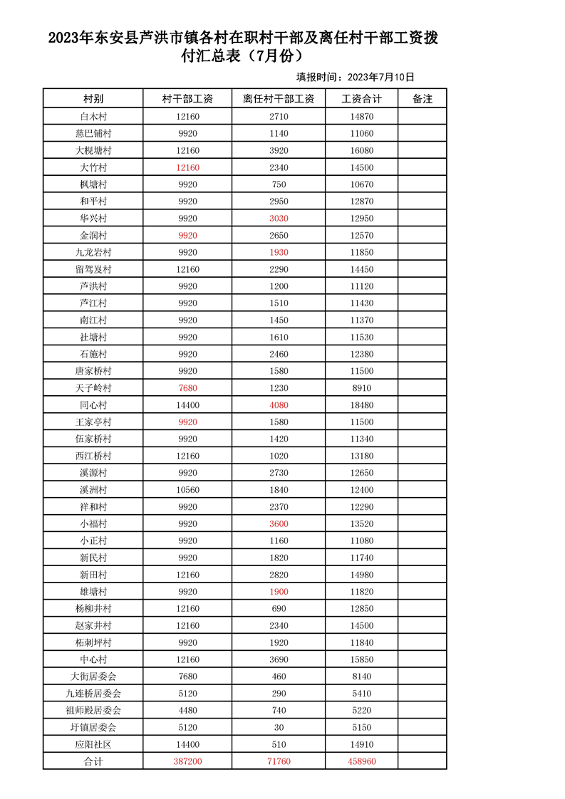 芦洪市镇2023年7月份村干部工资公示