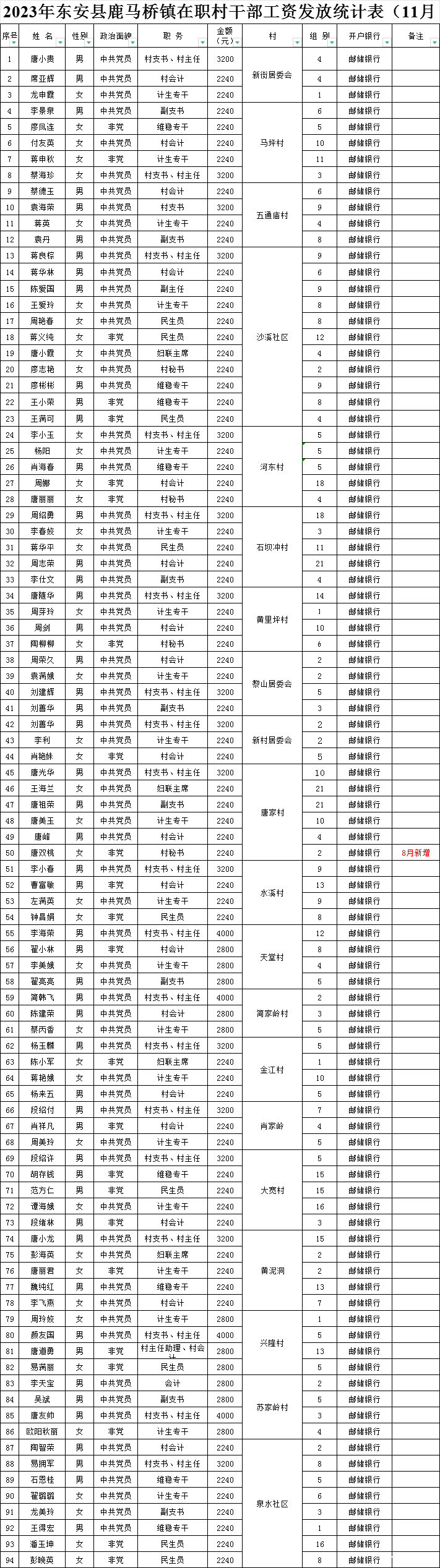 2023年ray雷竞技官网入口鹿马桥镇在职村干部工资发放统计表(11月份)