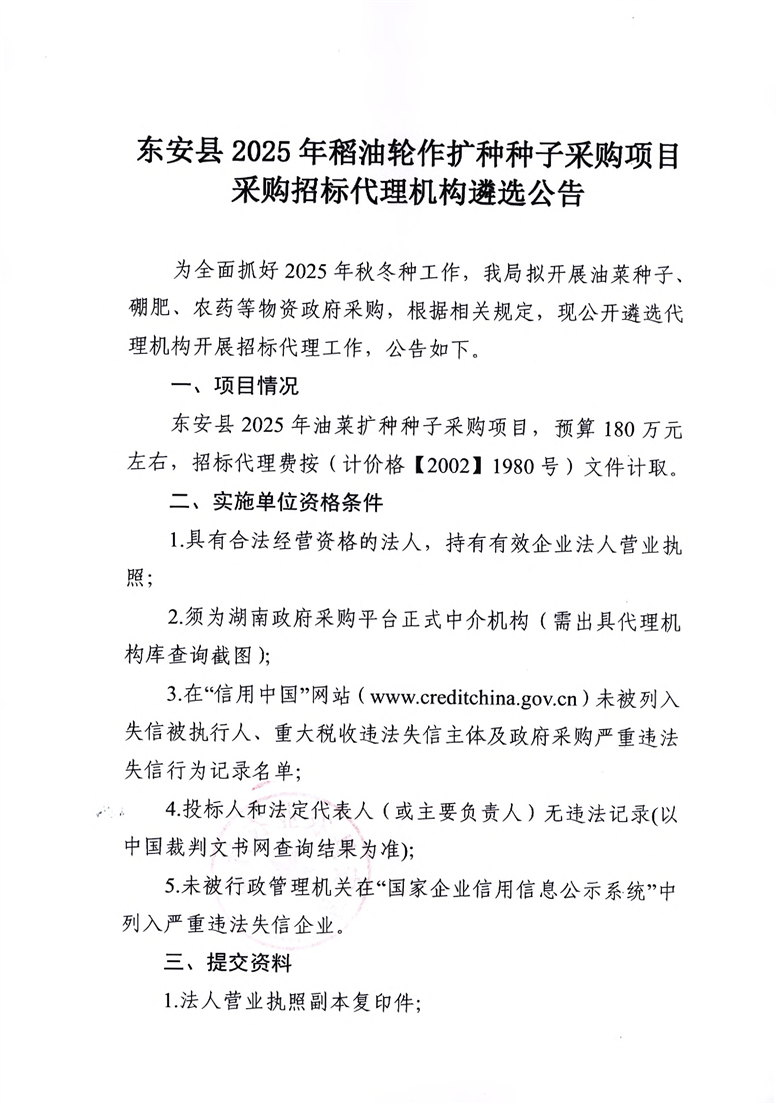ray雷竞技官网入口2025年稻油轮作扩种种子采购项目采购招标代理机构遴选公告