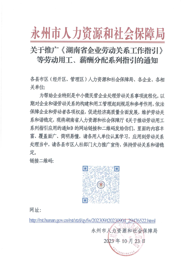 关于推广《湖南省企业劳动关系工作指引等劳动用工、薪酬分配系列指引》的通知