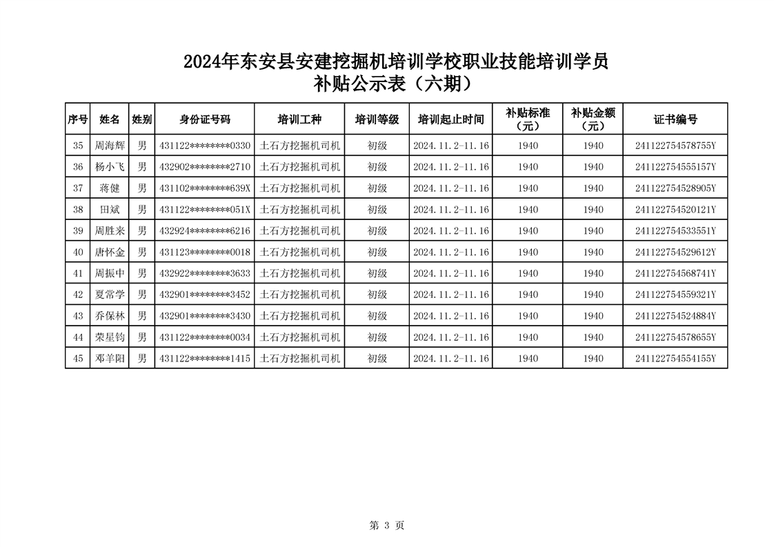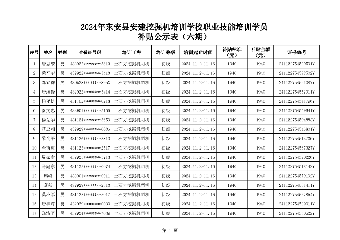 2024年ray雷竞技官网入口安建挖掘机培训学校职业技能培训学员 补贴公示表(六期)