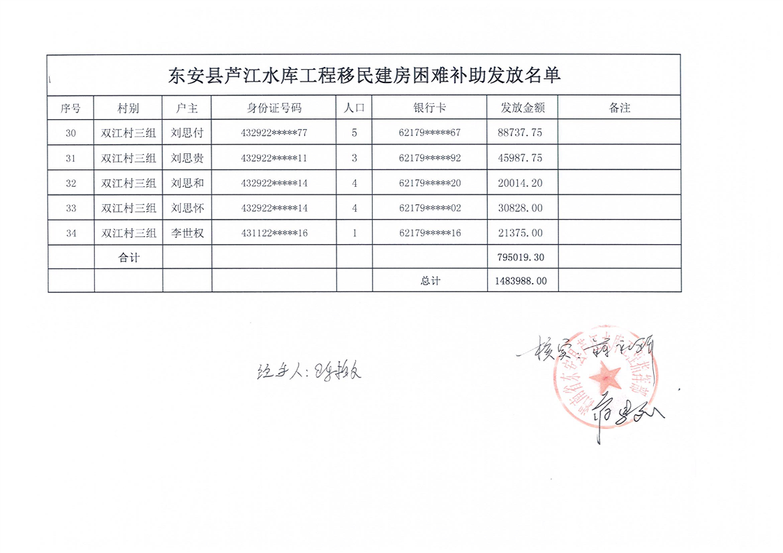 芦江水库建房困难补偿款发放名单