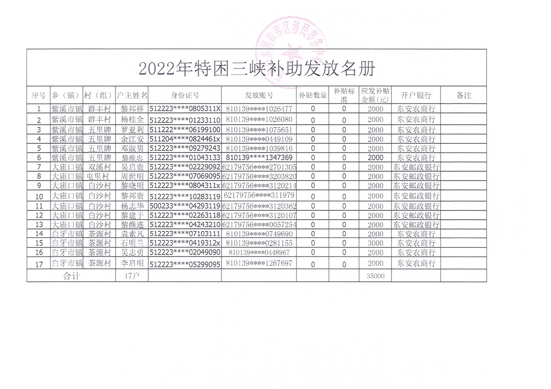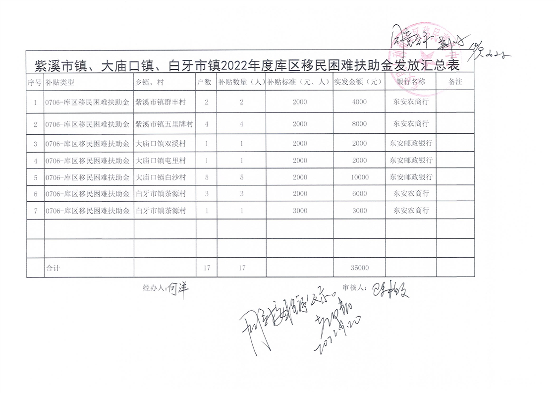 名称: 紫溪市镇、大庙口镇、白牙市镇2022年度库区移民困难扶助金发放汇总表