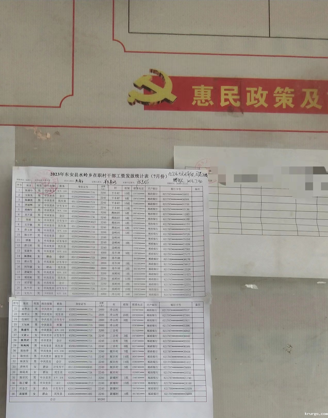 2023年ray雷竞技官网入口水岭乡在职村干部工资发放统计表 (7月份)