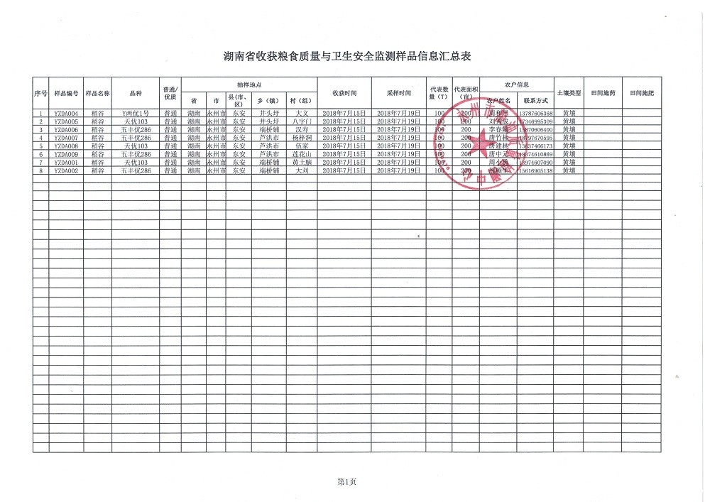 名称: 湖南省收获粮食质量与卫生安全检测样品信息汇总(东安)