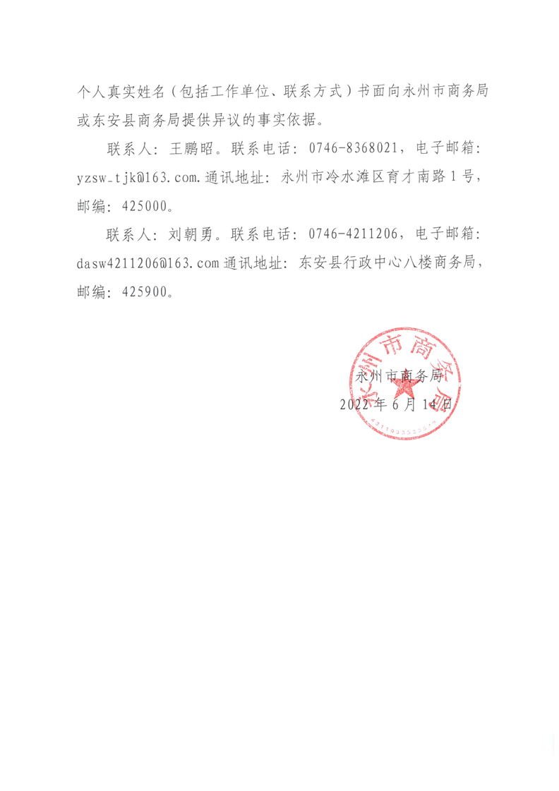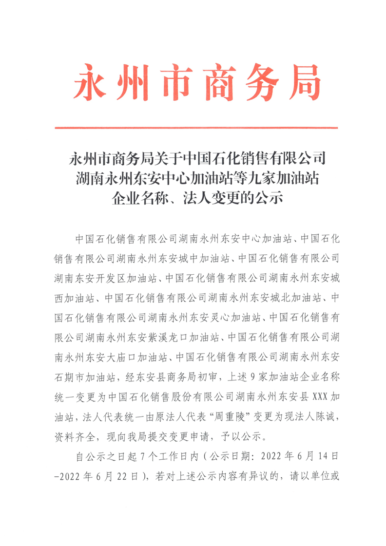 名称: 永州市商务局关于中国石化销售有限公司湖南永州东安中心加油站企业名称、法人变更的公示