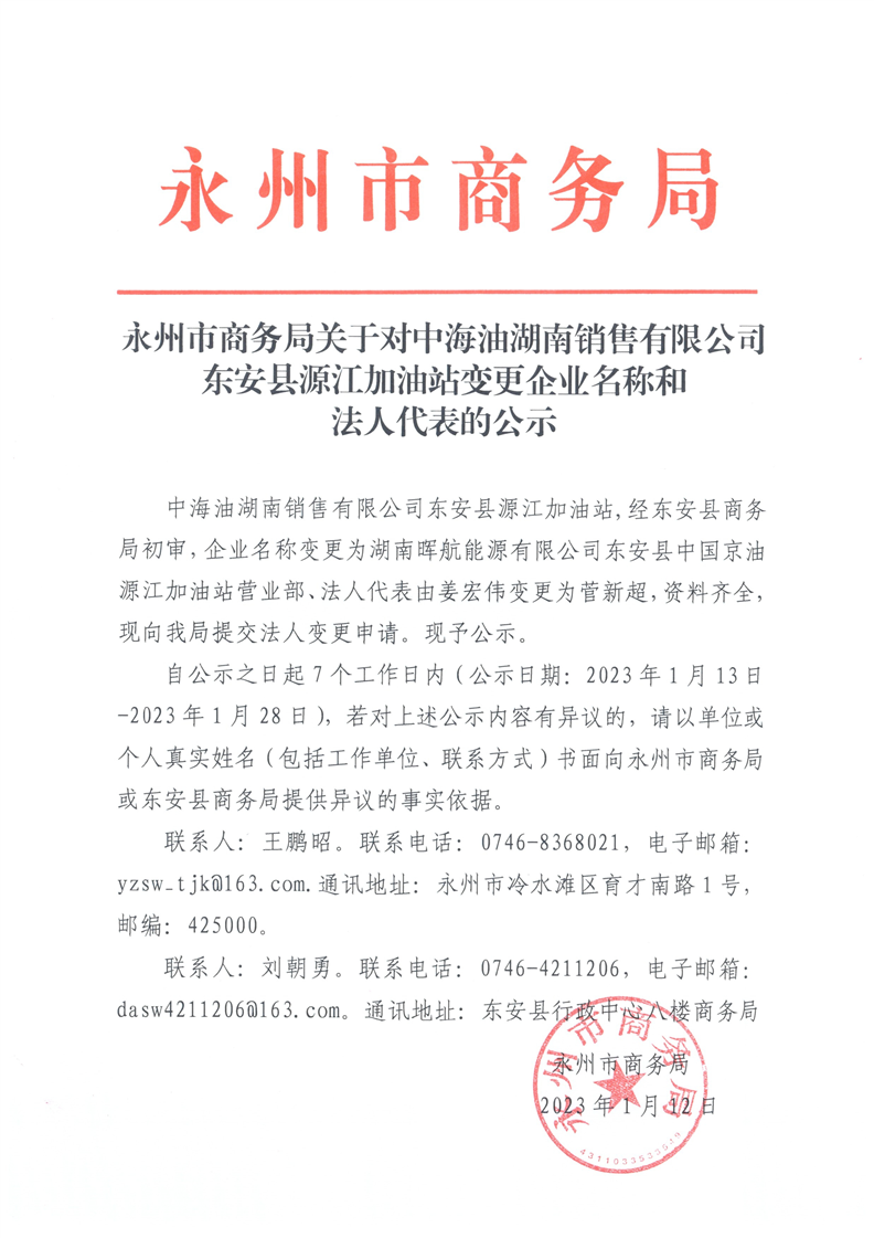 名称: 永州市商务局关于对中海油湖南销售有限公司ray雷竞技官网入口源江加油站变更企业名称和法人代表的公示