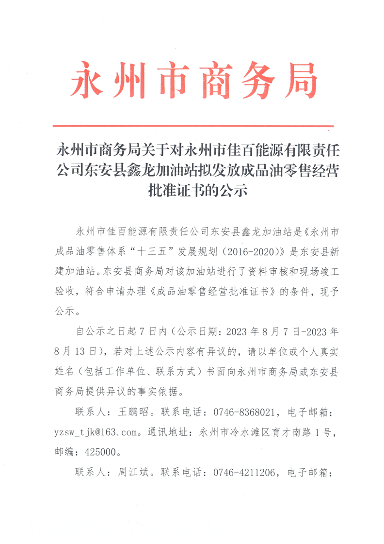 永州市商务局关于对永州市佳百能源有限责任公司ray雷竞技官网入口鑫龙加油站拟发放成品油零售经营批准证书的公示