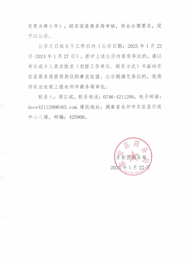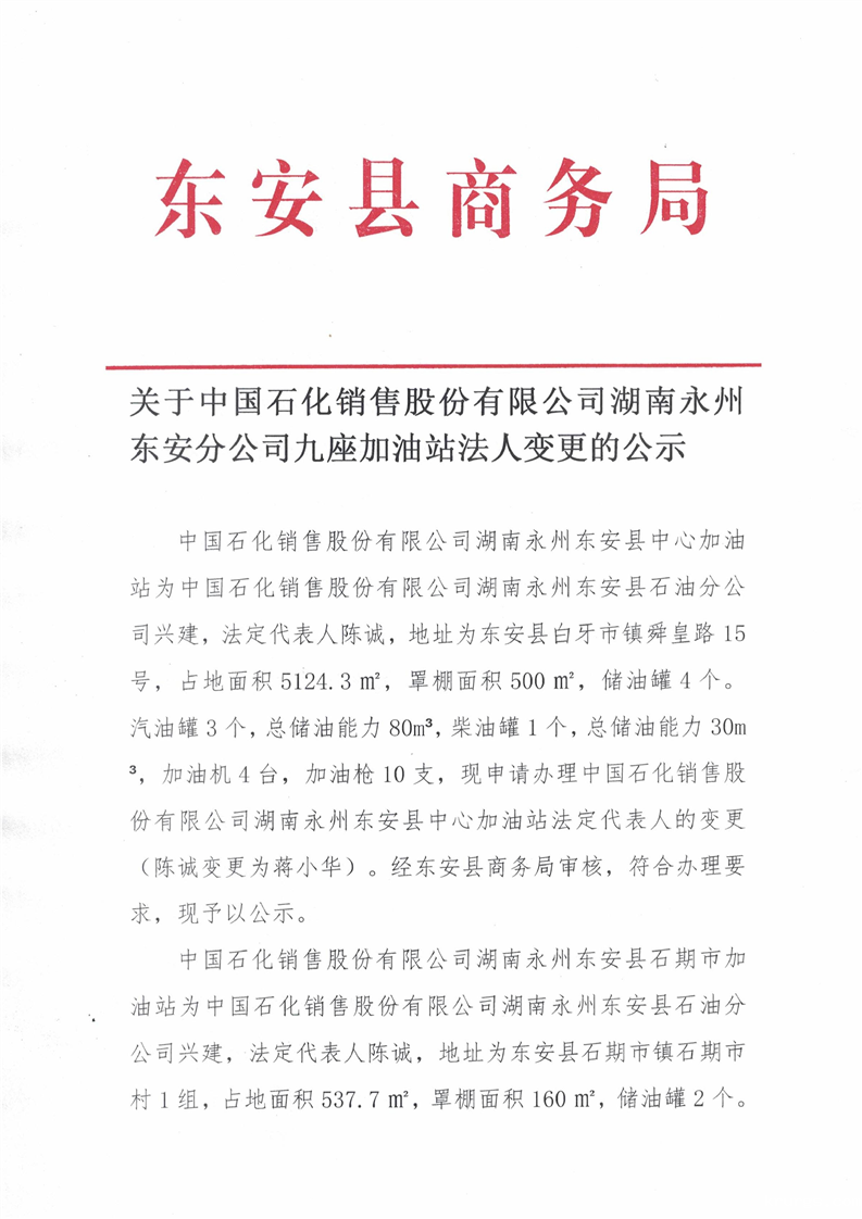 关于中国石化销售股份有限公司湖南永州东安分公司九座加油站法人变更的公示