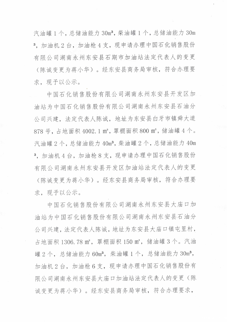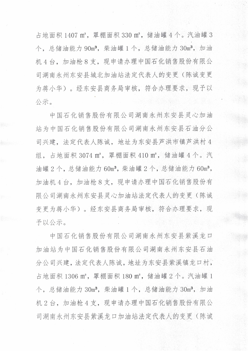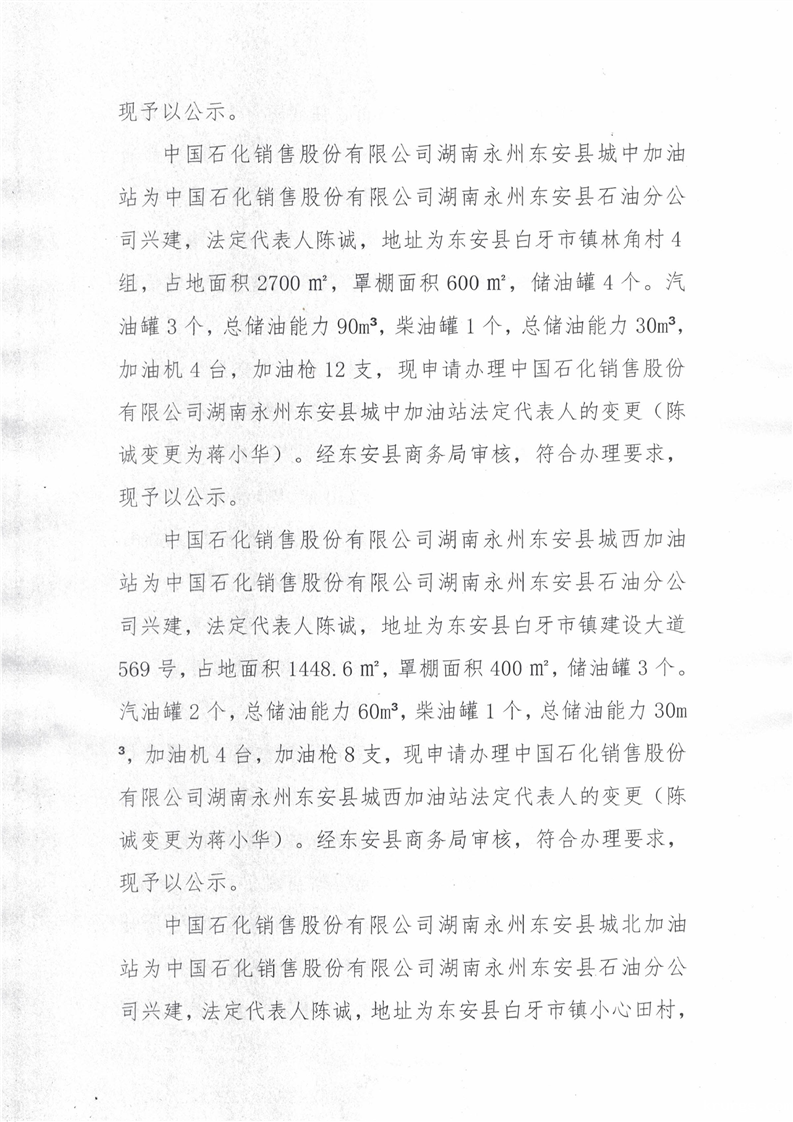 名称: 关于中国石化销售股份有限公司湖南永州东安分公司九座加油站法人变更的公示