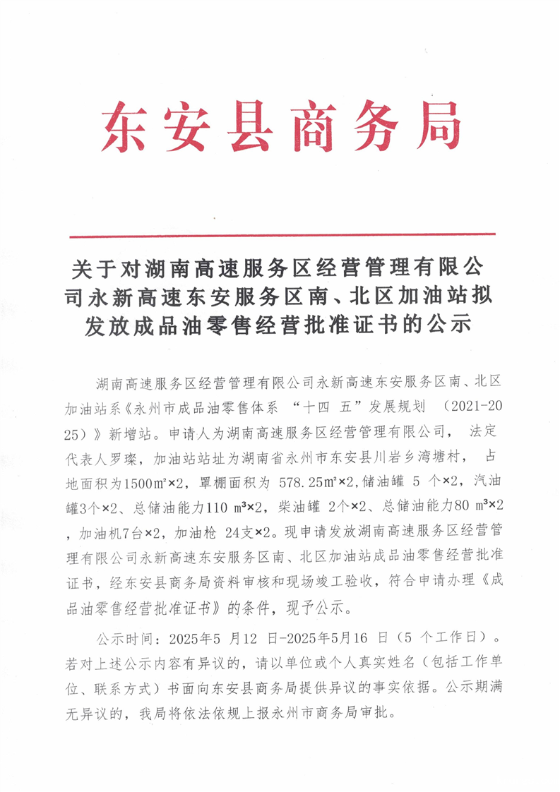名称: 关于对湖南高速服务区经营管理有限公司永新高速东安服务区南、北区加油站拟发放成品油零售经营批准证书的公示