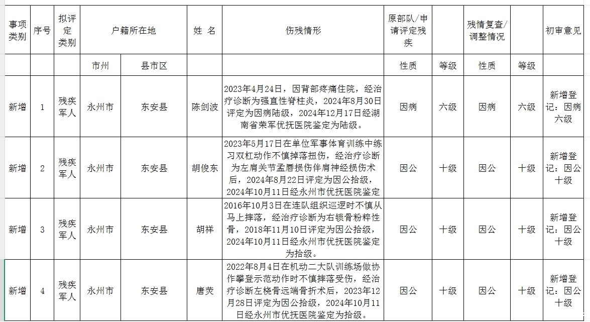 2025年ray雷竞技官网入口新增、新/补评残疾军人公示表(一)