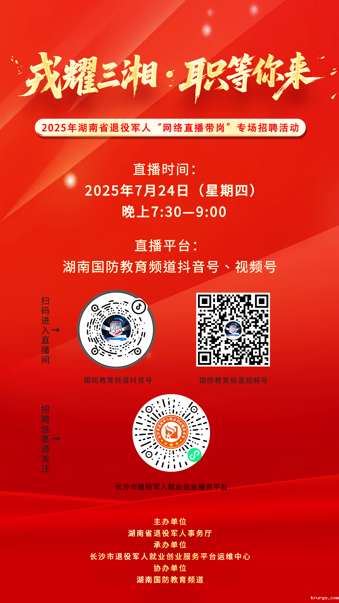 直播活动由长沙市退役军人就业创业服务平台联合湖南国防教育频道承办,各市州退役军人事务局、招聘企业优质岗位推介官连线助力,为退役军人找工作提供服务保障。