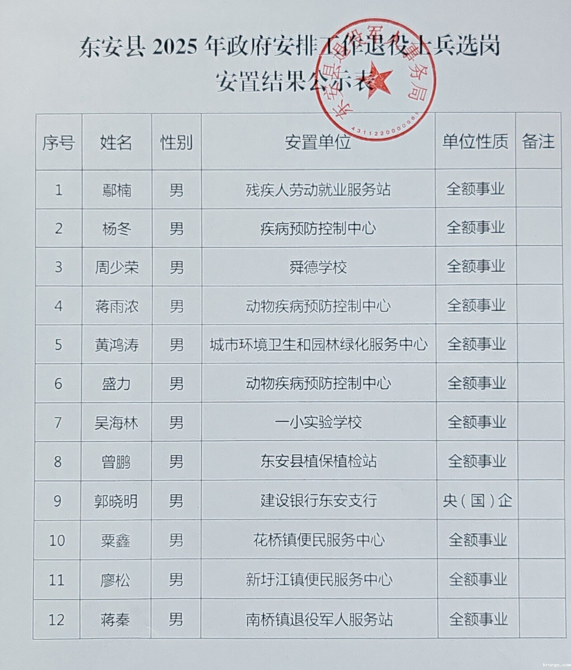 ray雷竞技官网入口2025年政府安排工作退役士兵选岗结果公示