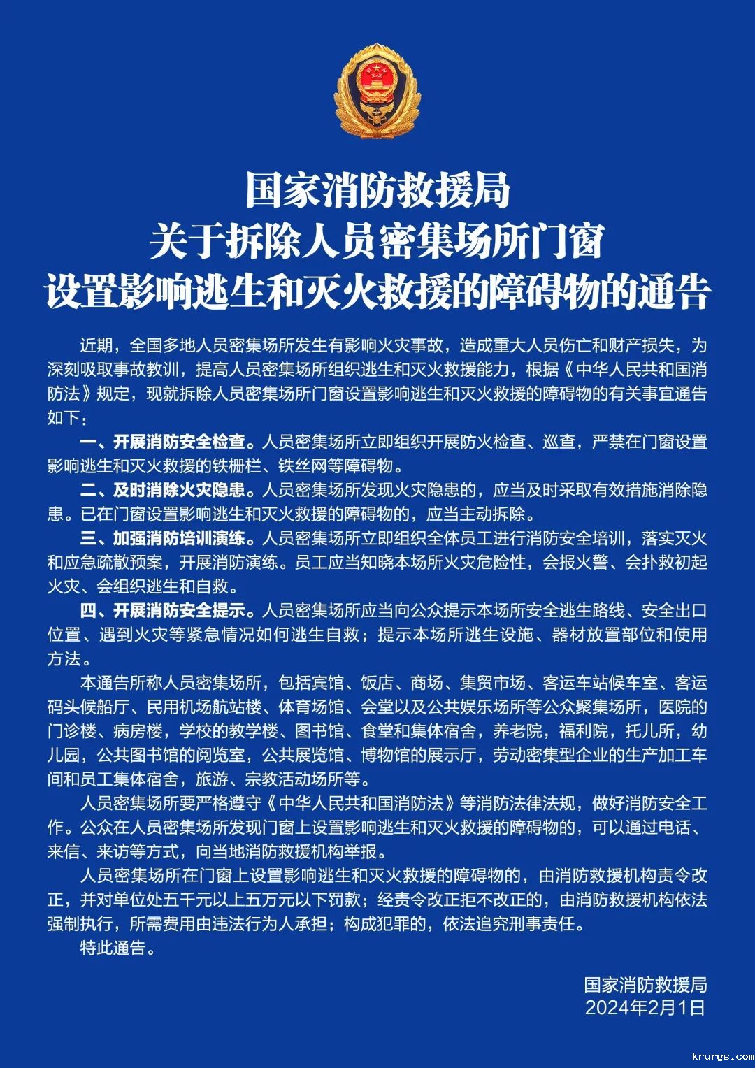 国家消防救援局发布关于拆除人员密集场所门窗设置影响逃生和灭火救援的障碍物的通告