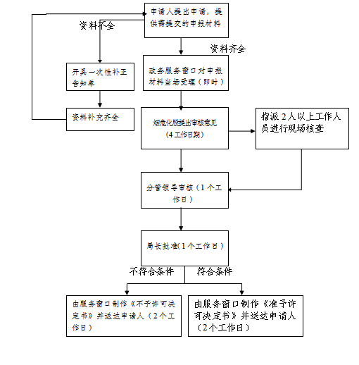 申请人提出申请,提供需提交的申报材料→受理:服务窗口对申报材料当场作出处理→烟危股初审(4工作日)→指派2人以上工作人员进行现场核查→股长复审(2个工作日)→分管领导审核(1个工作日)→局长批准(1个工作日)→由服务窗口制作《准予许可决定书》并送达申请人。联系电话: