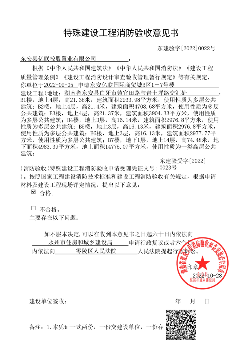 名称: 东安亿联国际商贸城B区1-7号楼消防验收意见公示