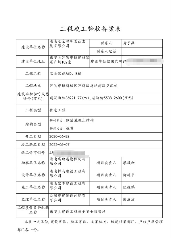 名称: 汇金凯旋城D、E栋竣工验收备案表