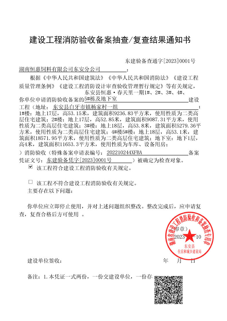 ray雷竞技官网入口恒惠·春天里一期1#、2#、3#、4#、5#栋及地下室消防验收备案结果公示