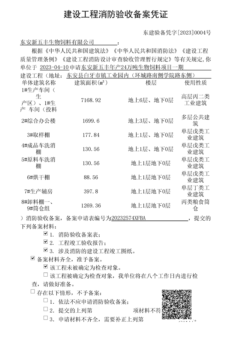 东安新五丰年产24万吨生物饲料项目一期消防验收备案结果公示