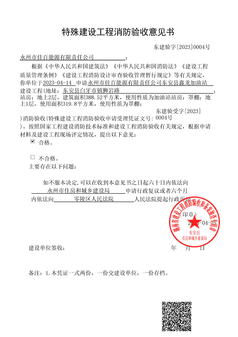 永州市佳百能源有限责任公司ray雷竞技官网入口鑫龙加油站消防验收意见公示