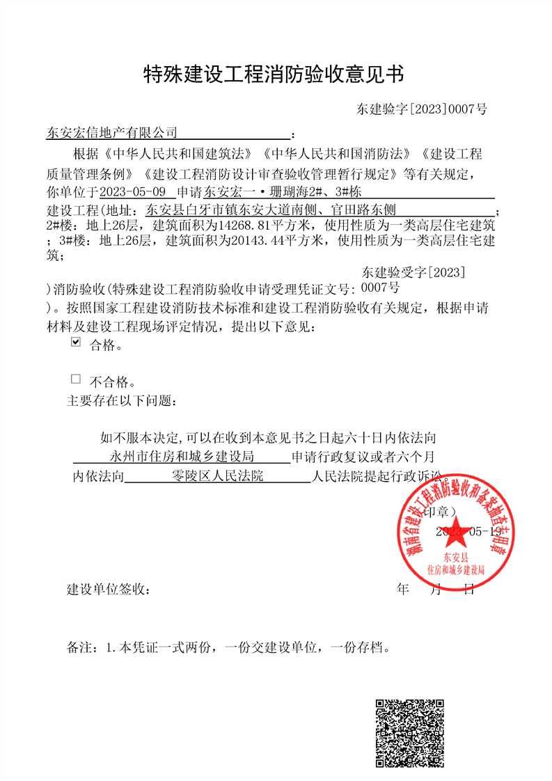 东安宏一·珊瑚海2#、3#栋消防验收意见公示