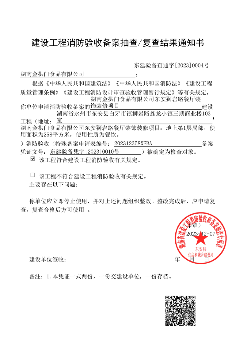 名称: 湖南金拱门食品有限公司东安狮岩路餐厅装饰装修项目消防验收备案结果公示