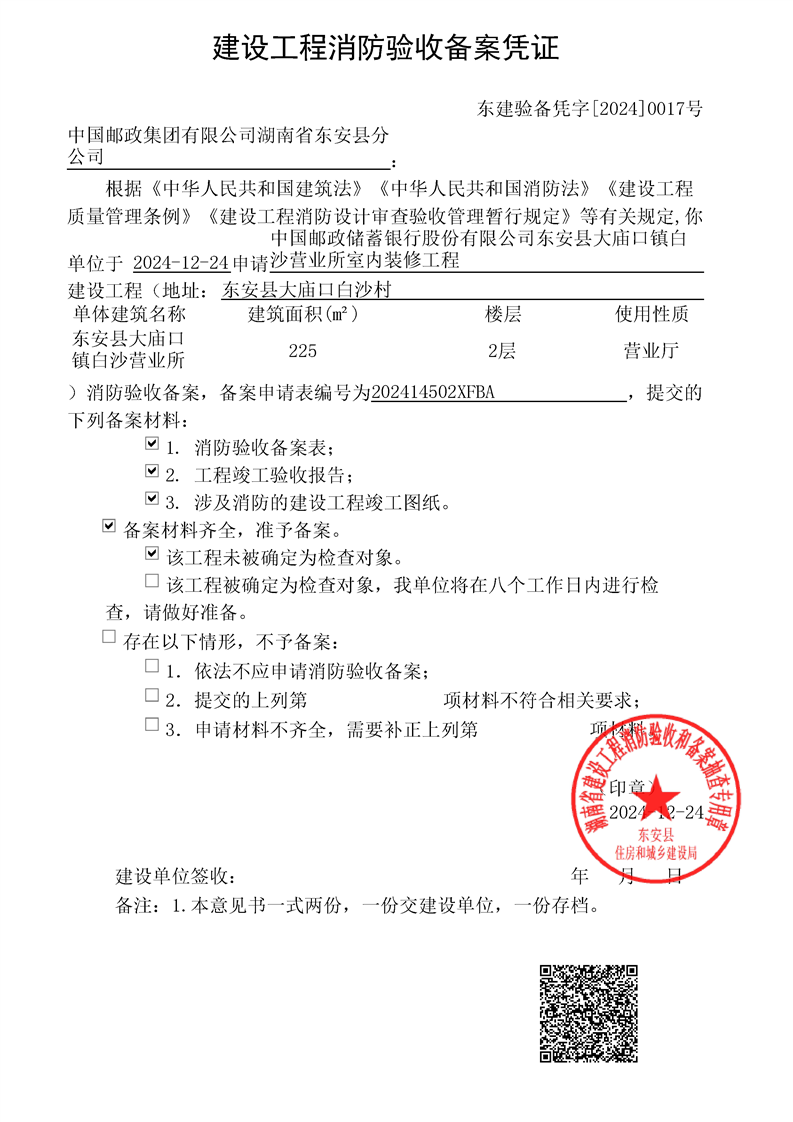 中国邮政储蓄银行股份有限公司ray雷竞技官网入口大庙口镇白沙营业所室内装修工程消防验收备案结果公示