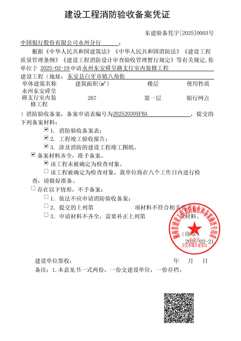 永州东安舜皇路支行室内装修工程消防验收备案结果公示